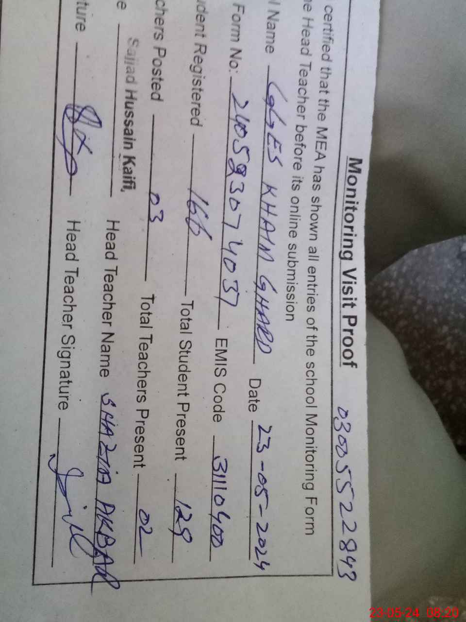 | Name: SH**** AK**** Designation: (School Headmaster's/Headmistress's) SST( G) Phone/Cell Number: 03**** |