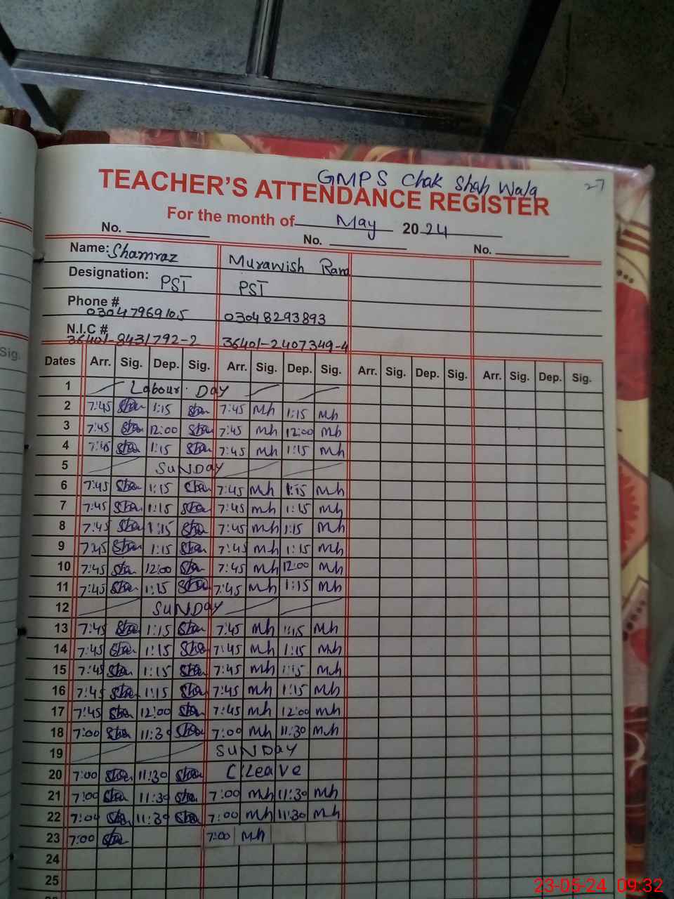 | CNIC | Full Name | Designation | R/C | Absence During Last Calender Month |