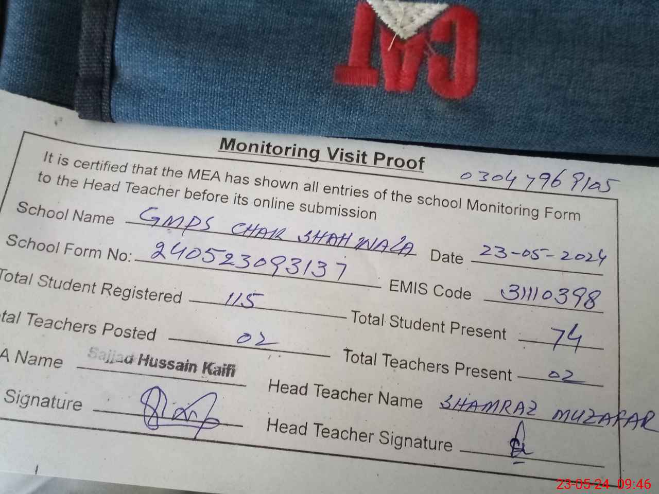 | Attendance Register | Head Teacher | MEA with School | Visit Proof |