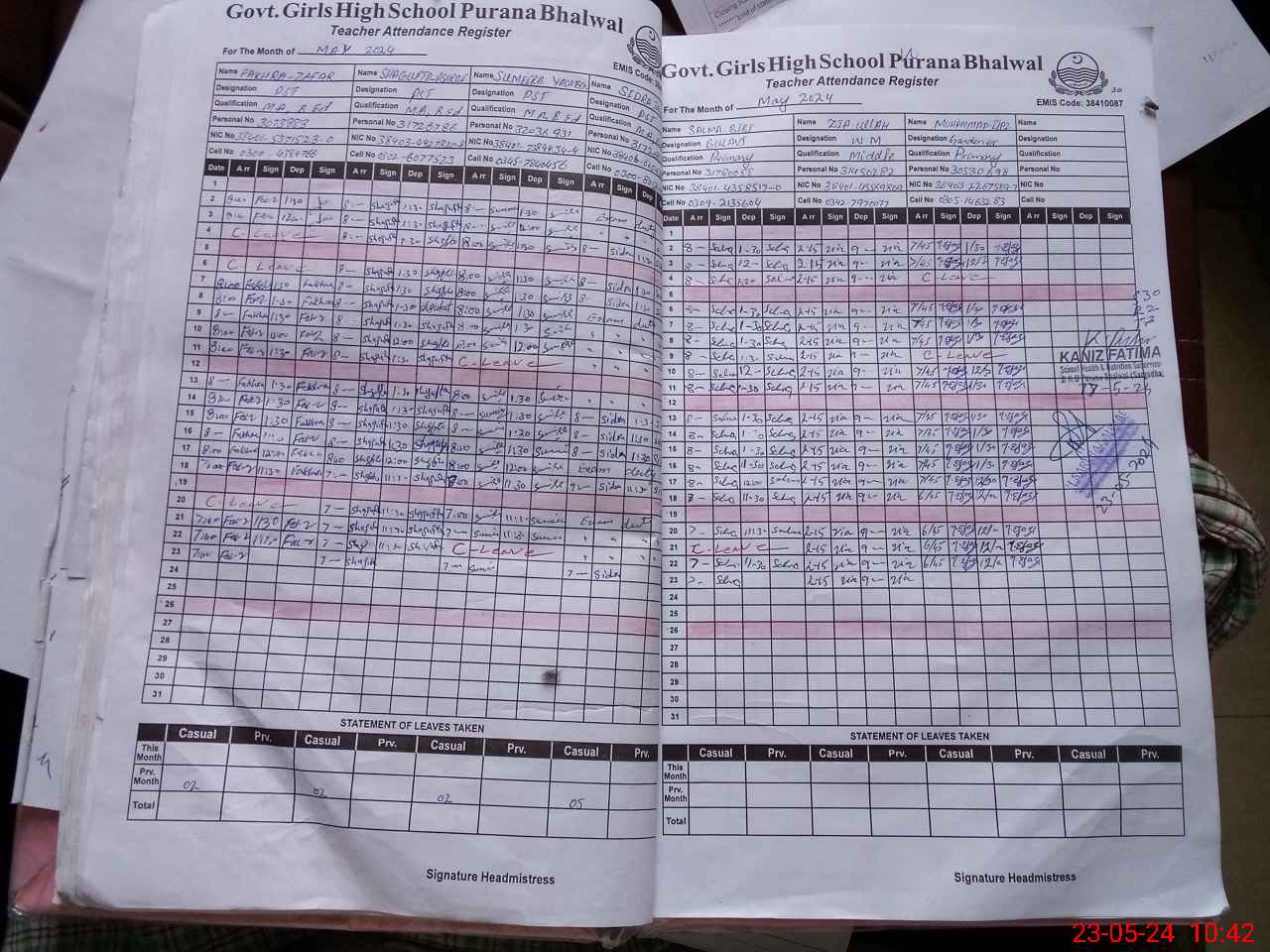 | CNIC | Full Name | Designation | R/C | Absence During Last Calender Month |
