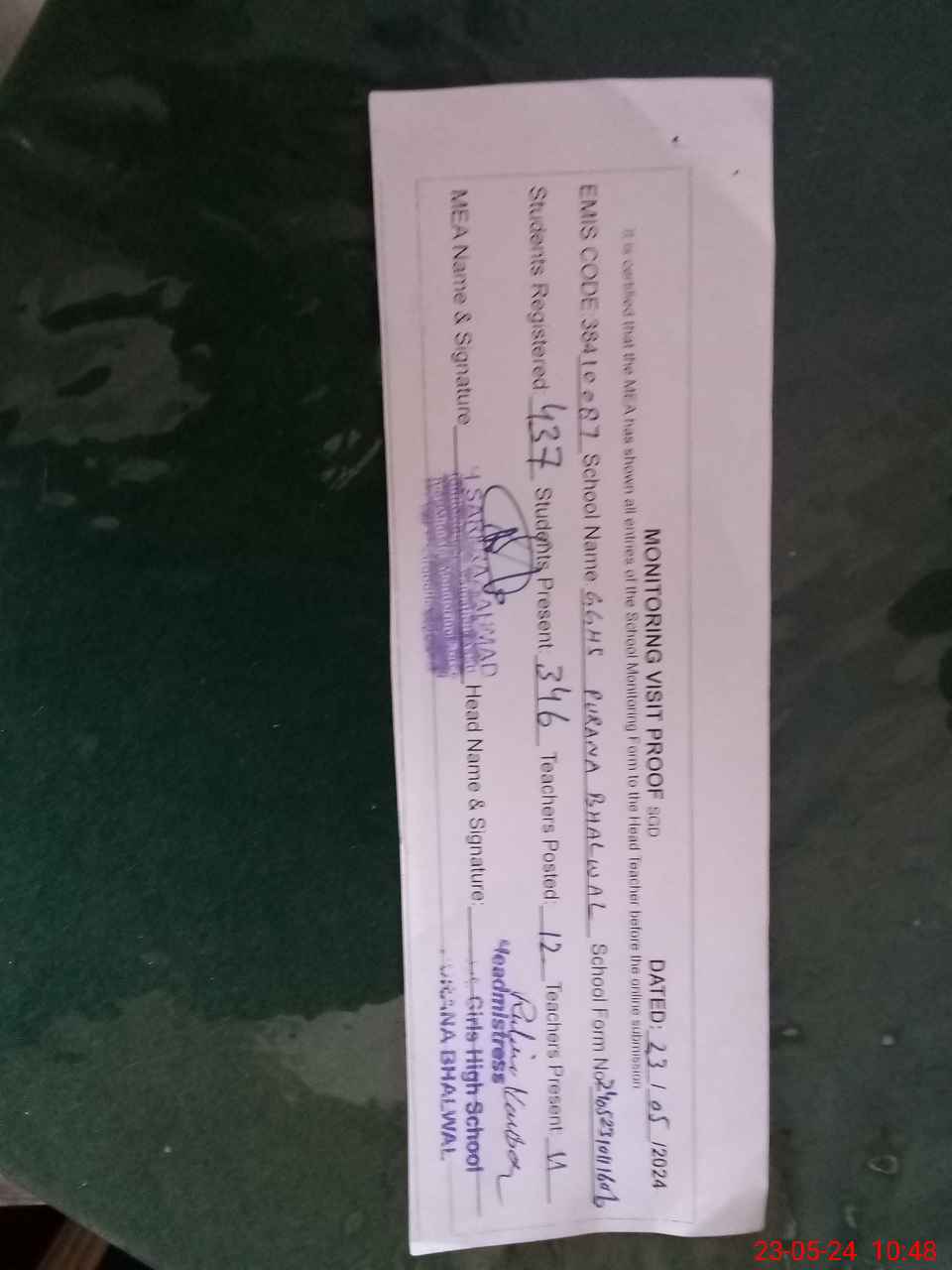 | Attendance Register | Head Teacher | MEA with School | Visit Proof |
