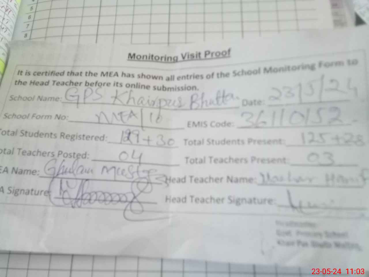 | EMIS Code: 36110152 | Name of School: GPS KHAIR PUR BHUTTA CANTT P/O QASIM BELLA | |||