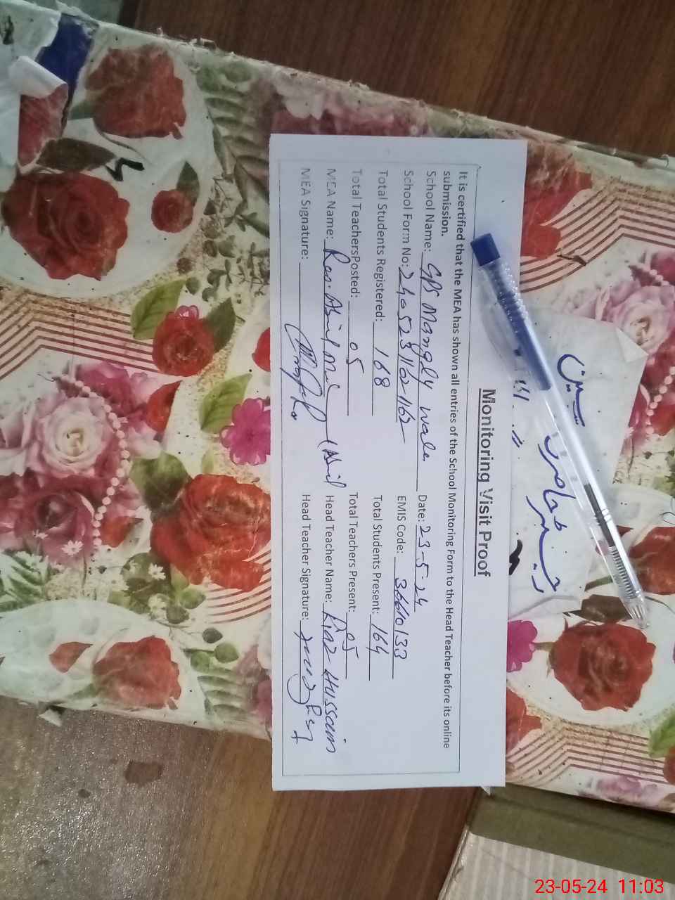 | Attendance Register | Head Teacher | MEA with School | Visit Proof |