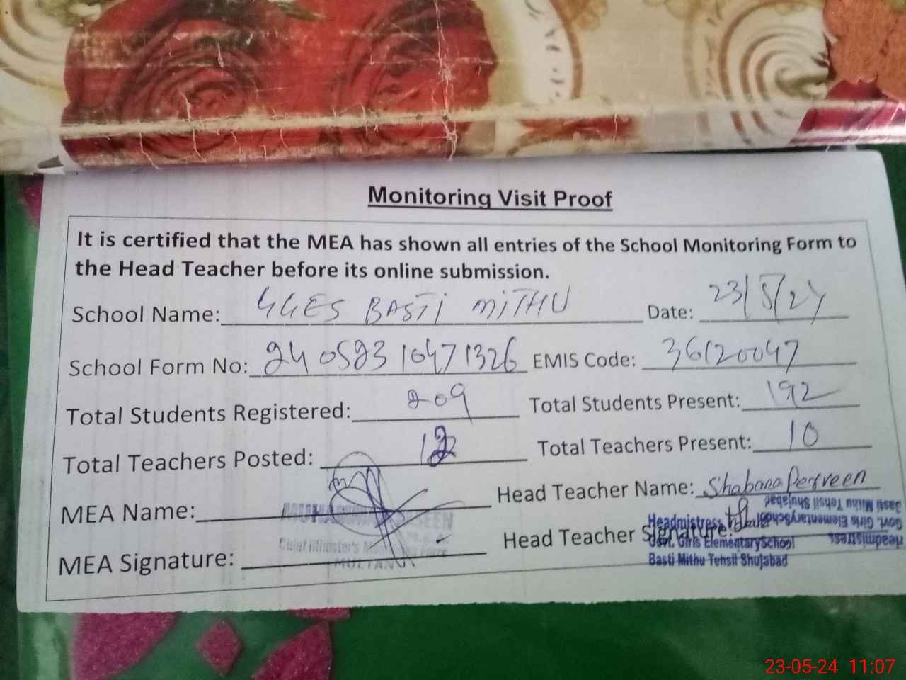 | Certified that this School was Inspected by the Undersigned MEA/DMO Today and the Information Stated Above is as Per Record. | |||||