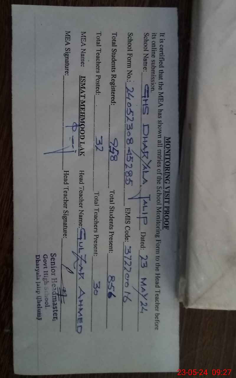 | EMIS Code: 37220016 | Name of School: GHS DHARYALA JALIB | |||