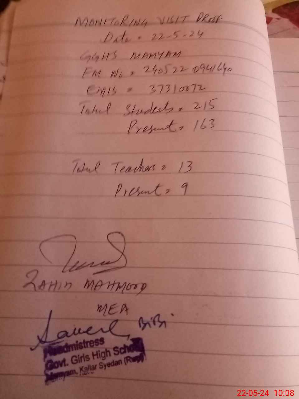 | Monitoring Date: 22-05-2024 | Start Time: 22-05-2024 09:36 AM | End Time: 22-05-2024 10:10 AM | Name of MEA: Za**** Me**** | |
