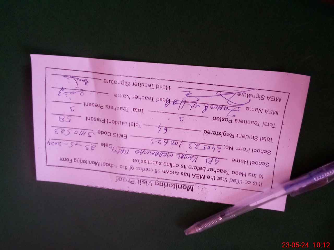 | Attendance Register | Head Teacher | MEA with School | Visit Proof |