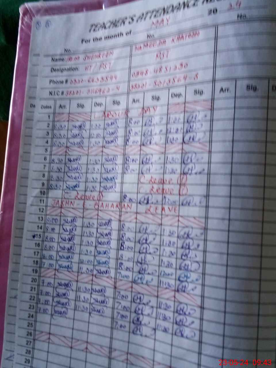 | Name: Ir**** Sh**** Designation: (School Headmaster's/Headmistress's) PST Phone/Cell Number: 03**** |