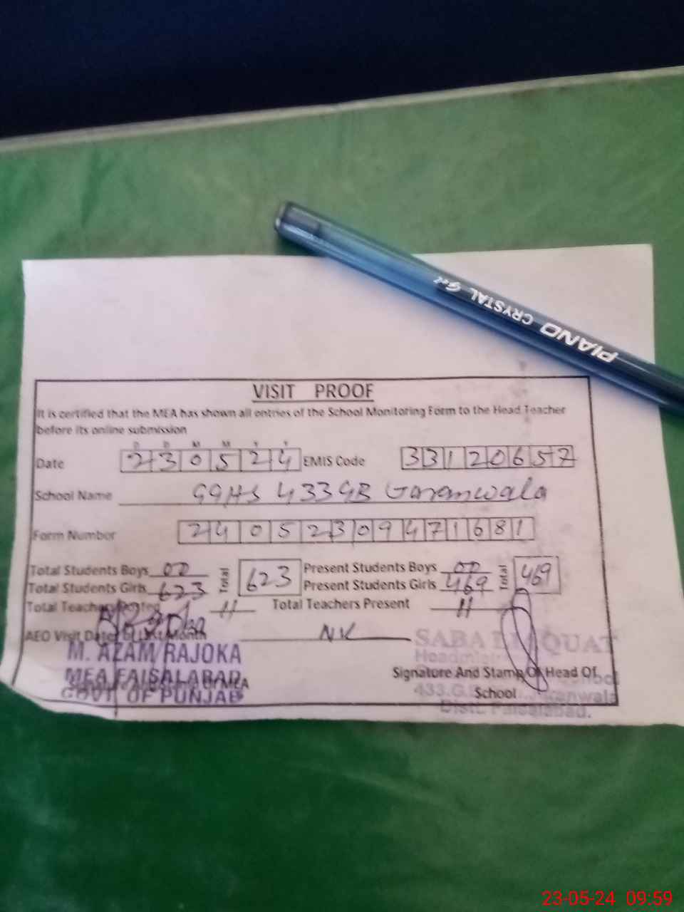| Attendance Register | Head Teacher | MEA with School | Visit Proof |