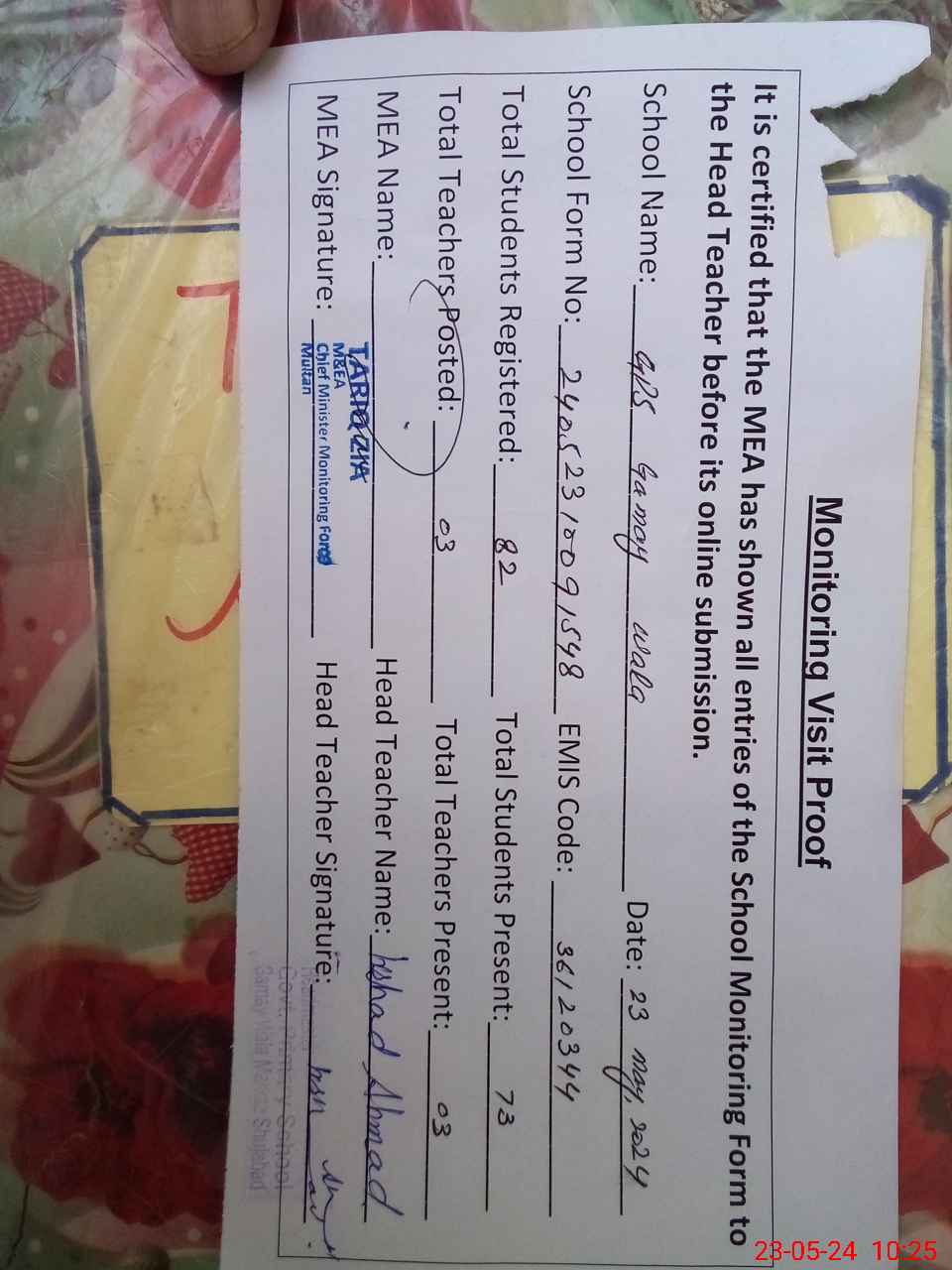 | EMIS Code: 36120344 | Name of School: GPS GAMAY WALA ADDA PIR GHAIB P/O NASEERPUR | |||