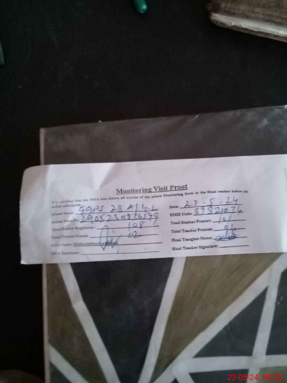 | Attendance Register | Head Teacher | MEA with School | Visit Proof |