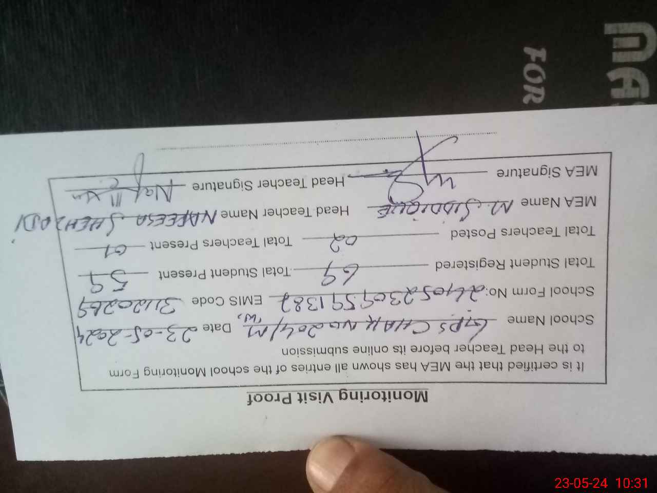 | Attendance Register | Head Teacher | MEA with School | Visit Proof |