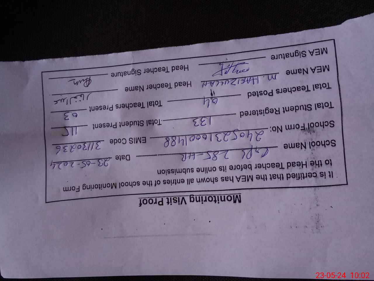 | Certified that this School was Inspected by the Undersigned MEA/DMO Today and the Information Stated Above is as Per Record. | |||||