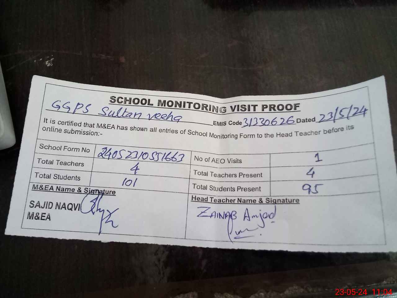 | Attendance Register | Head Teacher | MEA with School | Visit Proof |