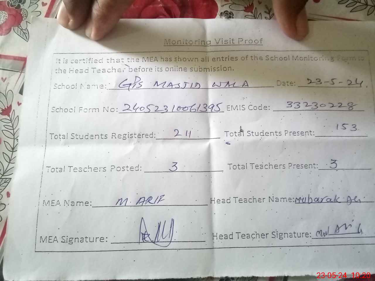 | EMIS Code: 33230228 | Name of School: GPS MASJID WALA | |||