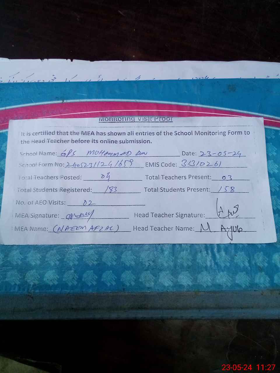 | EMIS Code: 31310261 | Name of School: GPS MUHAMMAD DIN | |||