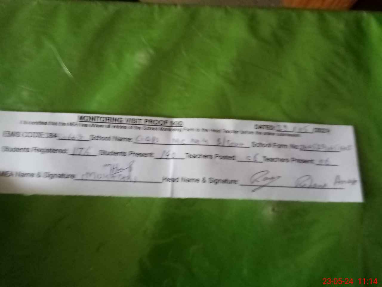 | Attendance Register | Head Teacher | MEA with School | Visit Proof |