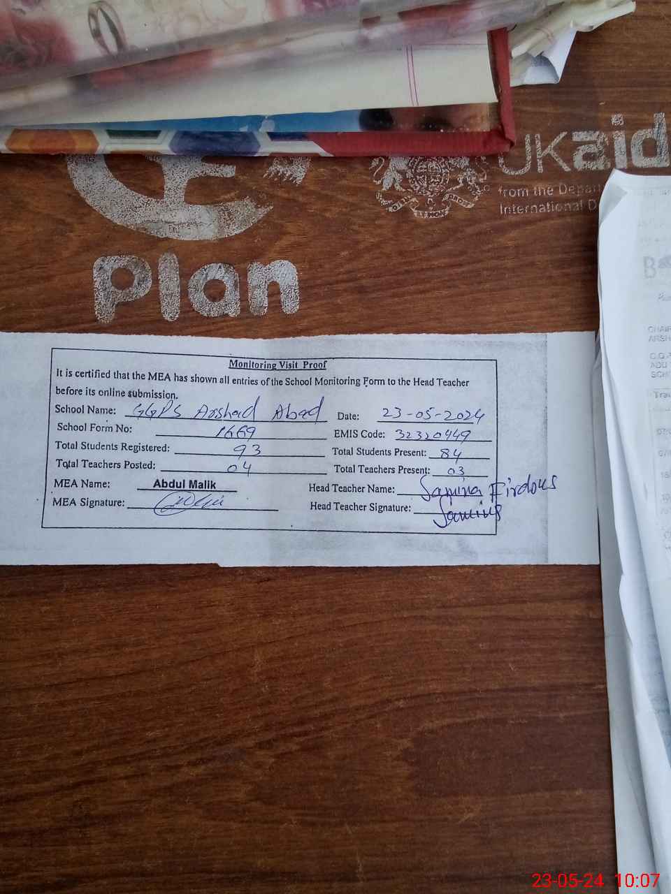 | Attendance Register | Head Teacher | MEA with School | Visit Proof |