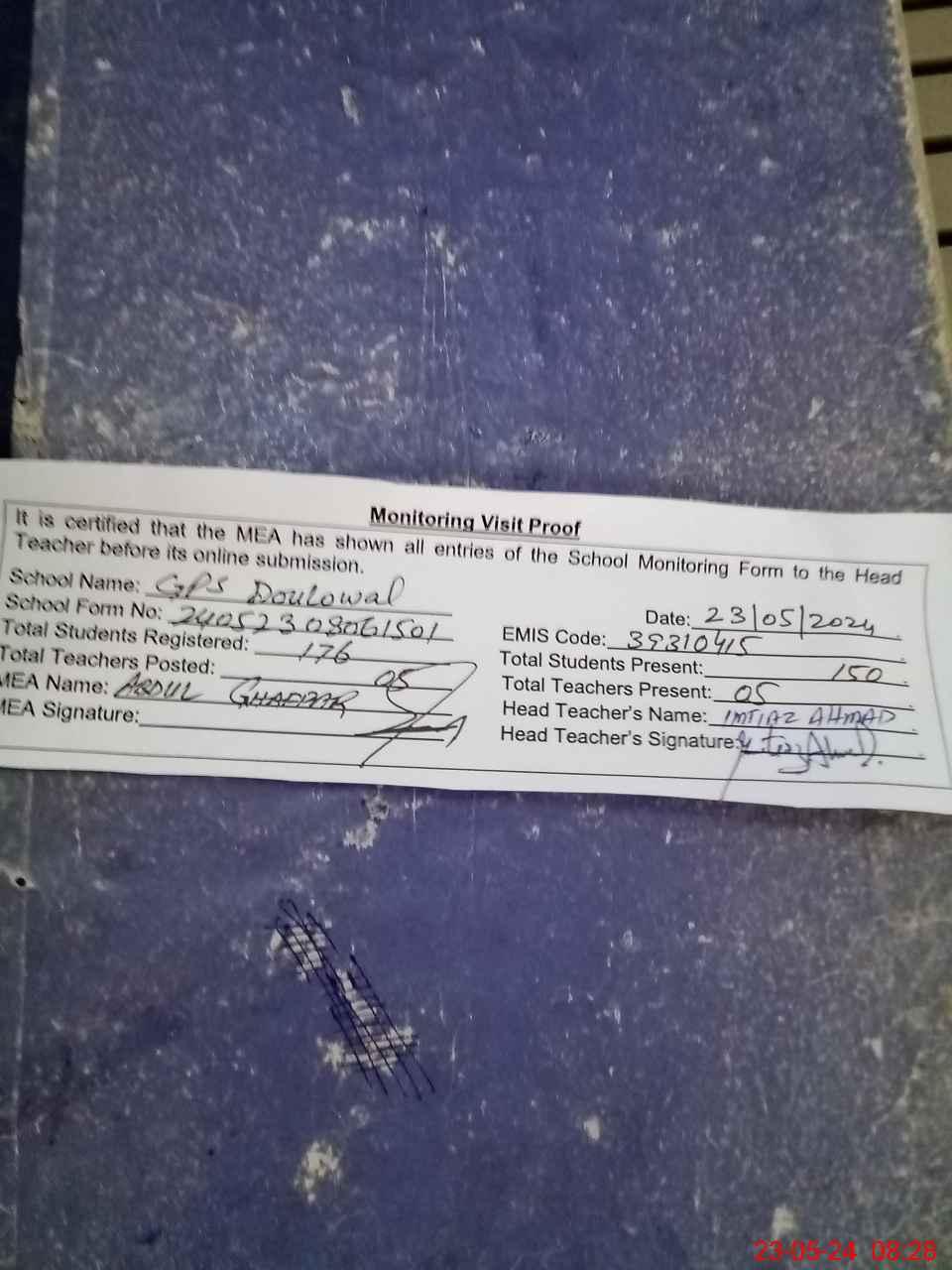 | Certified that this School was Inspected by the Undersigned MEA/DMO Today and the Information Stated Above is as Per Record. | |||||