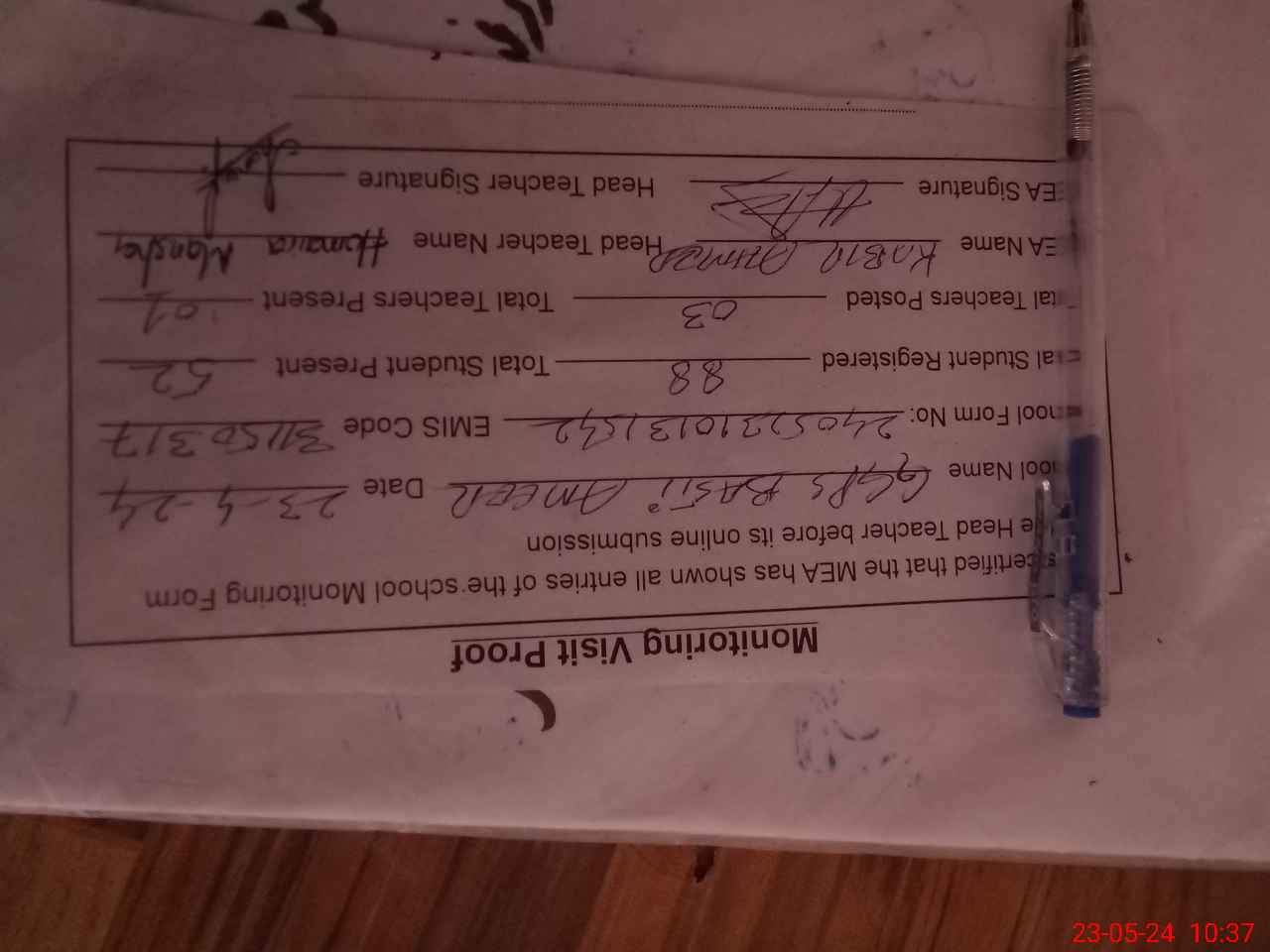 | Certified that this School was Inspected by the Undersigned MEA/DMO Today and the Information Stated Above is as Per Record. | |||||
