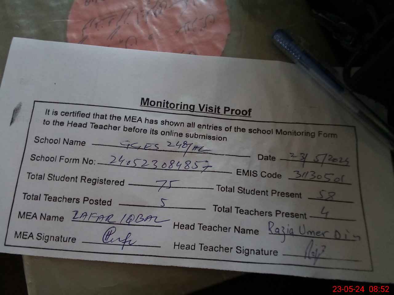 | Monitoring Date: 23-05-2024 | Start Time: 23-05-2024 08:33 AM | End Time: 23-05-2024 08:52 AM | Name of MEA: Za**** Iq**** BN**** | |