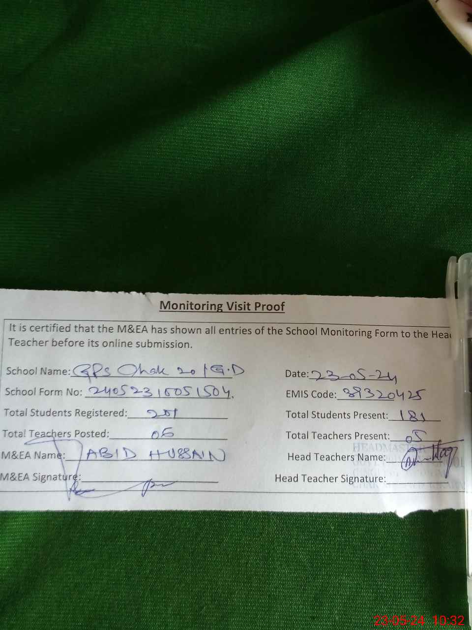 | Attendance Register | Head Teacher | MEA with School | Visit Proof |