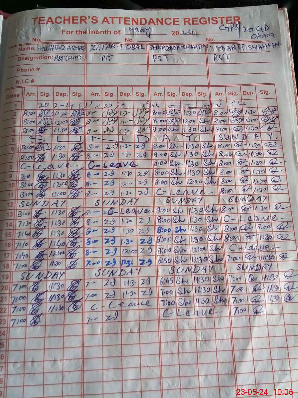 | CNIC | Full Name | Designation | R/C | Absence During Last Calender Month |