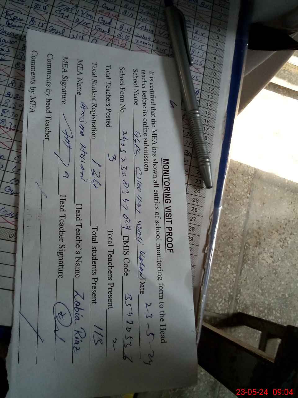 | Attendance Register | Head Teacher | MEA with School | Visit Proof |