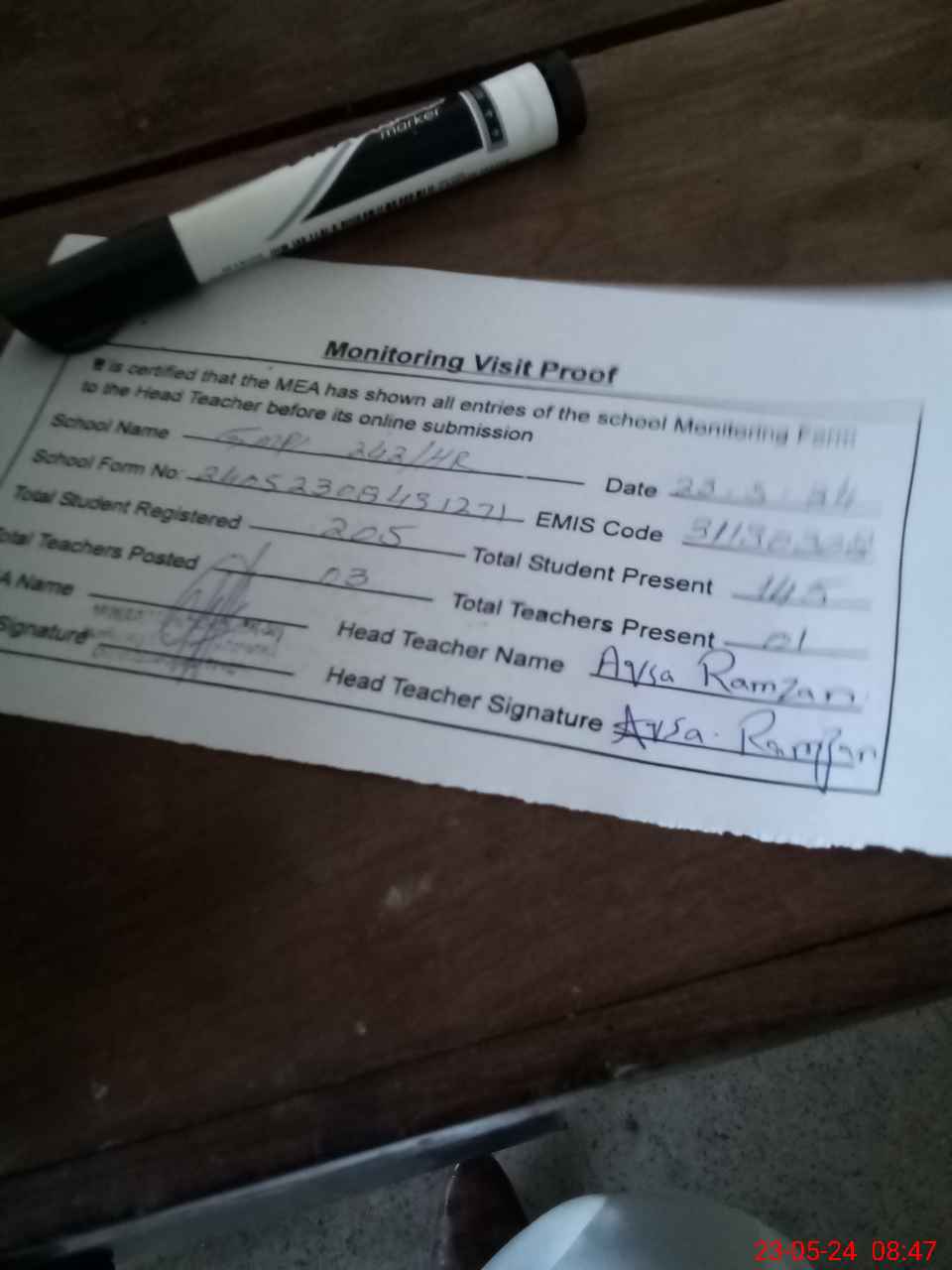 | Attendance Register | Head Teacher | MEA with School | Visit Proof |