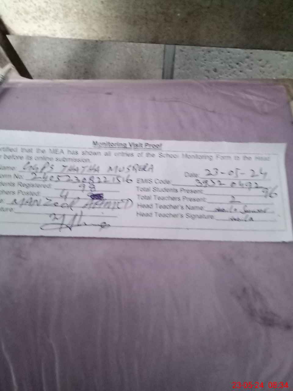 | Attendance Register | Head Teacher | MEA with School | Visit Proof |