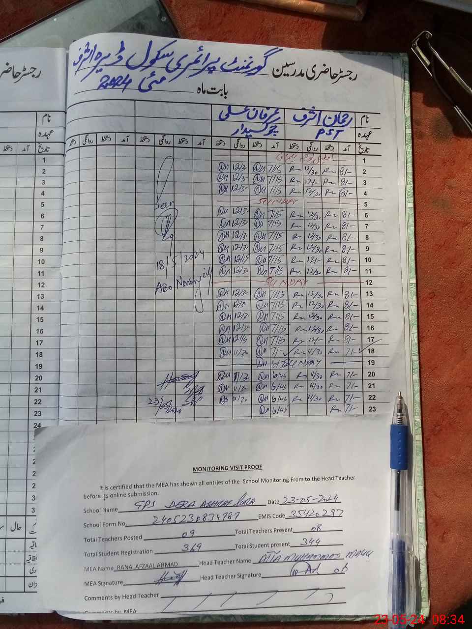 | Attendance Register | Head Teacher | MEA with School | Visit Proof |