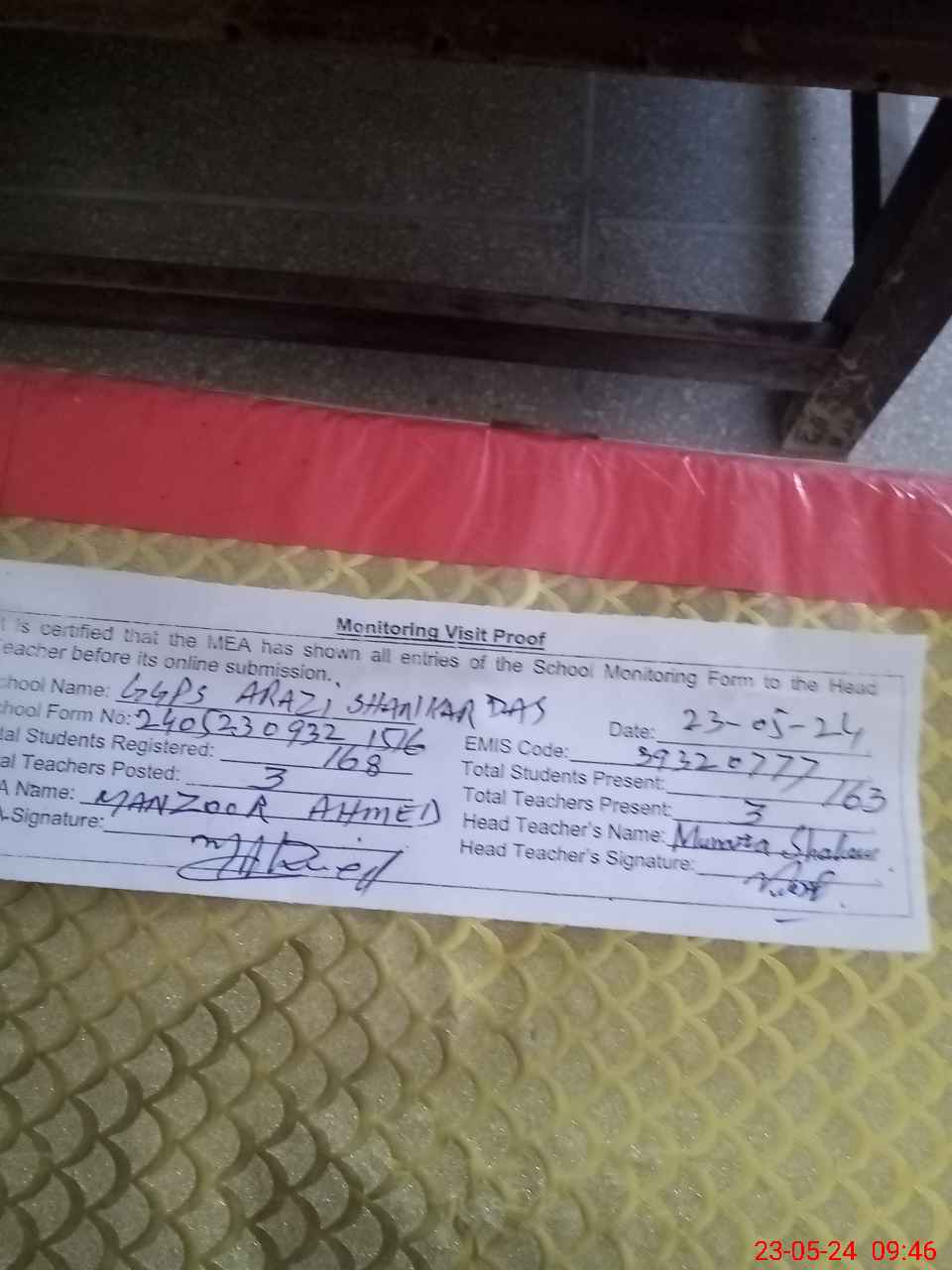 | Certified that this School was Inspected by the Undersigned MEA/DMO Today and the Information Stated Above is as Per Record. | |||||