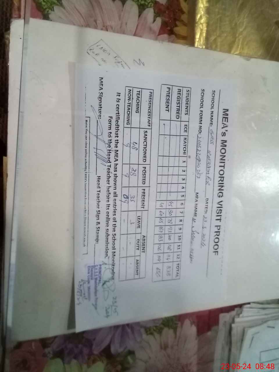 | Attendance Register | Head Teacher | MEA with School | Visit Proof |