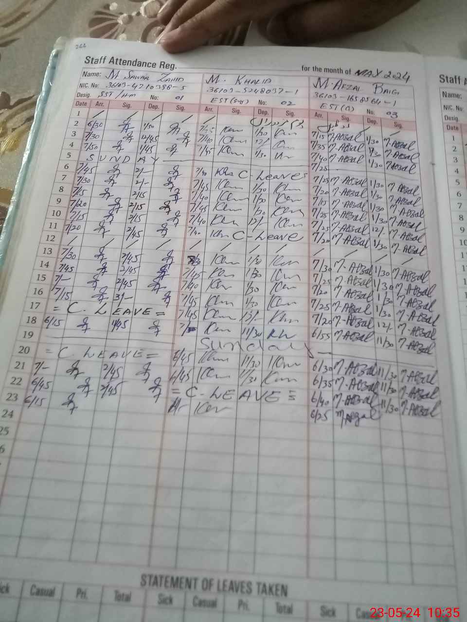 | CNIC | Full Name | Designation | R/C | Absence During Last Calender Month |
