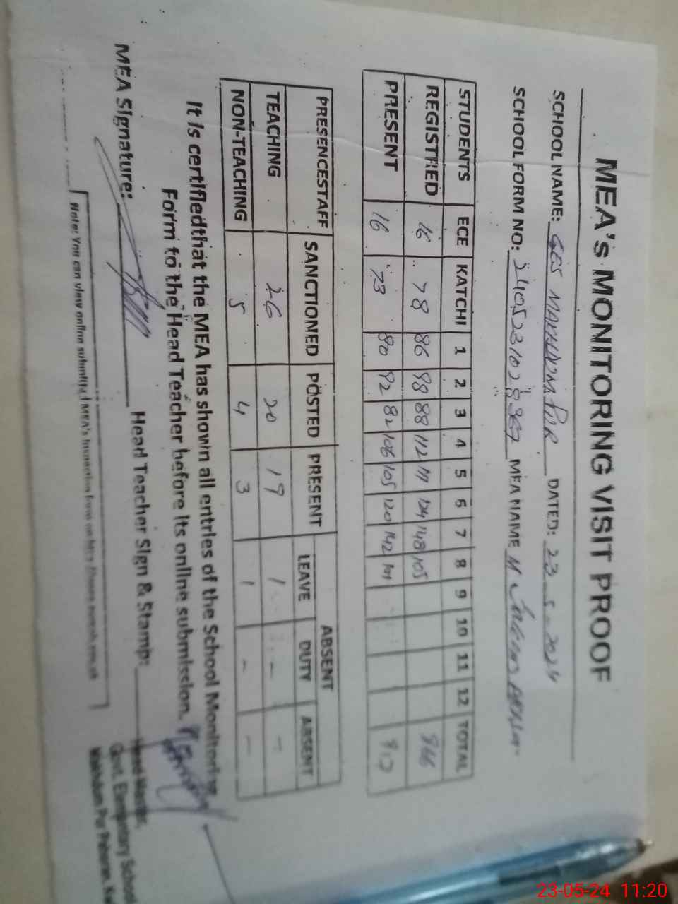 | Attendance Register | Head Teacher | MEA with School | Visit Proof |