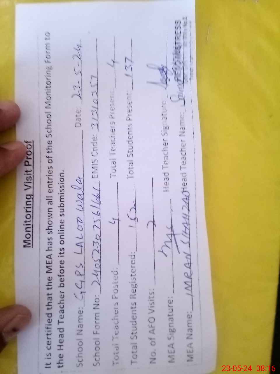 | Attendance Register | Head Teacher | MEA with School | Visit Proof |