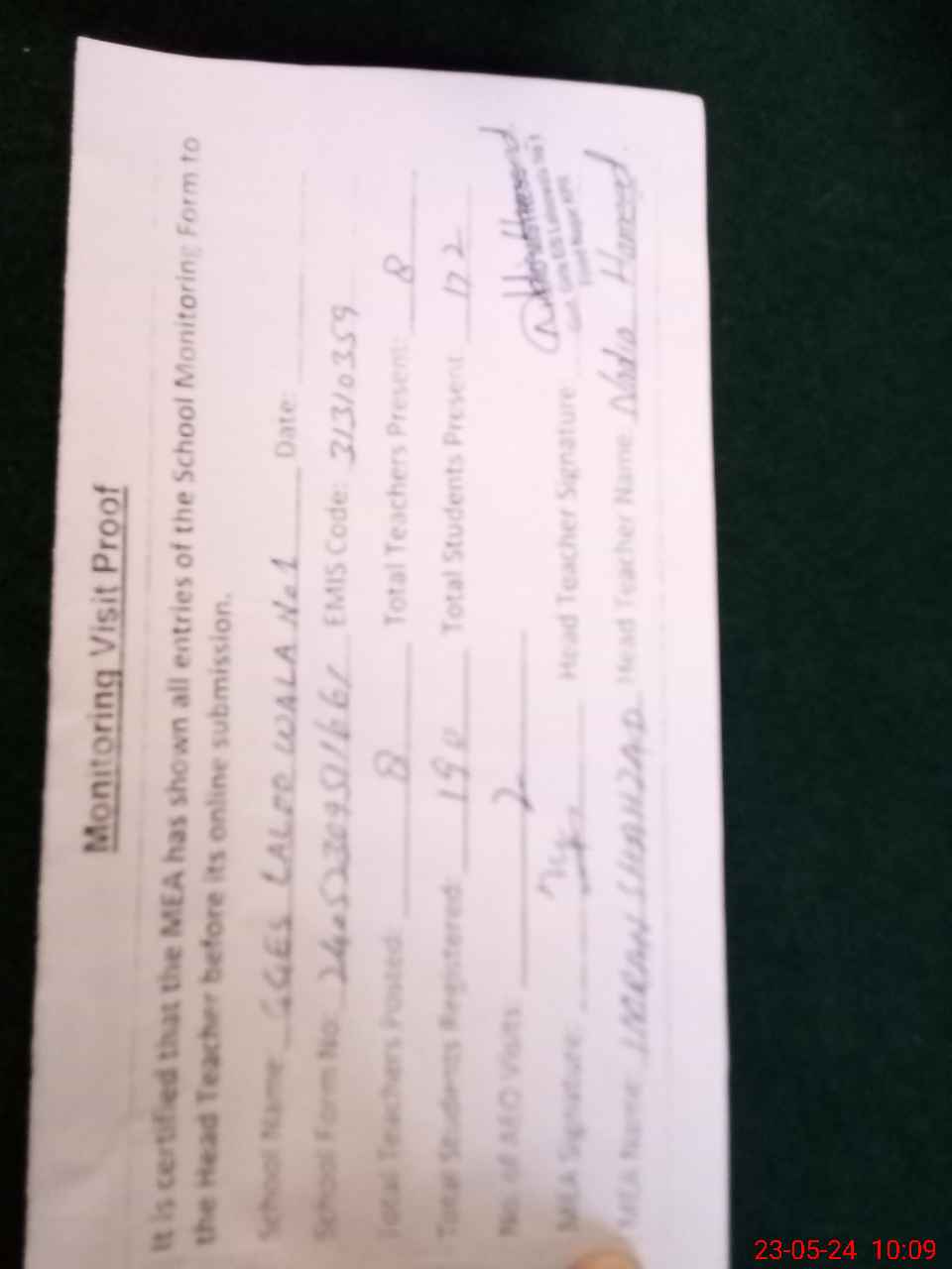| Attendance Register | Head Teacher | MEA with School | Visit Proof |