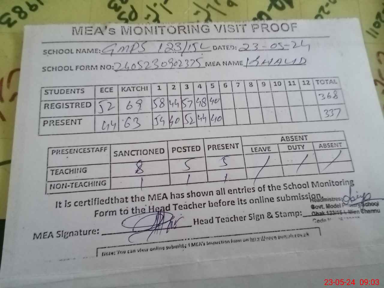 | EMIS Code: 36430320 | Name of School: GMPS123/15-L, MIAN CHANNU | |||