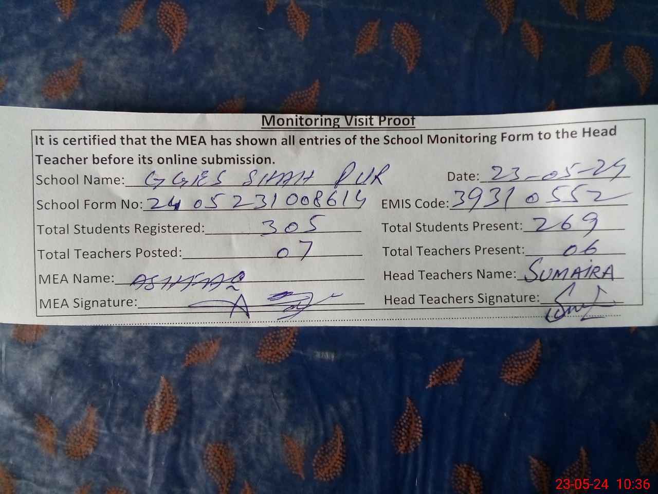 | Certified that this School was Inspected by the Undersigned MEA/DMO Today and the Information Stated Above is as Per Record. | |||||
