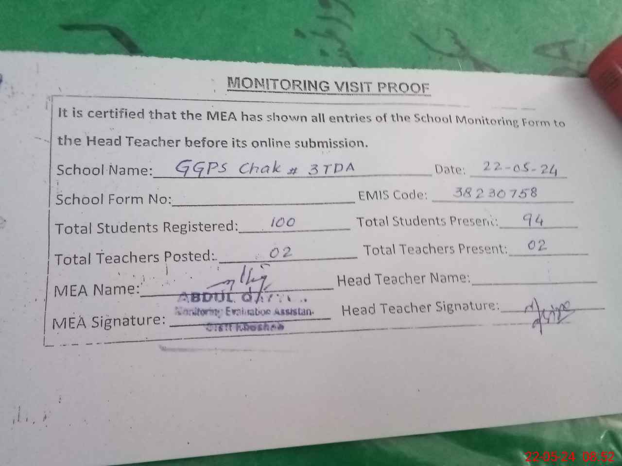 | Certified that this School was Inspected by the Undersigned MEA/DMO Today and the Information Stated Above is as Per Record. | |||||