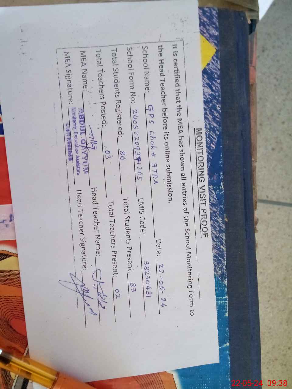 | Attendance Register | Head Teacher | MEA with School | Visit Proof |