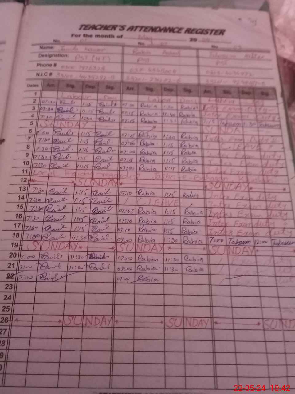 | 38**** | Ta**** Ak**** | PST | Regular | 0 | 0 | 0 | 0 | 0 | 0 | 0 | 0 | 0 | Exam Duty |