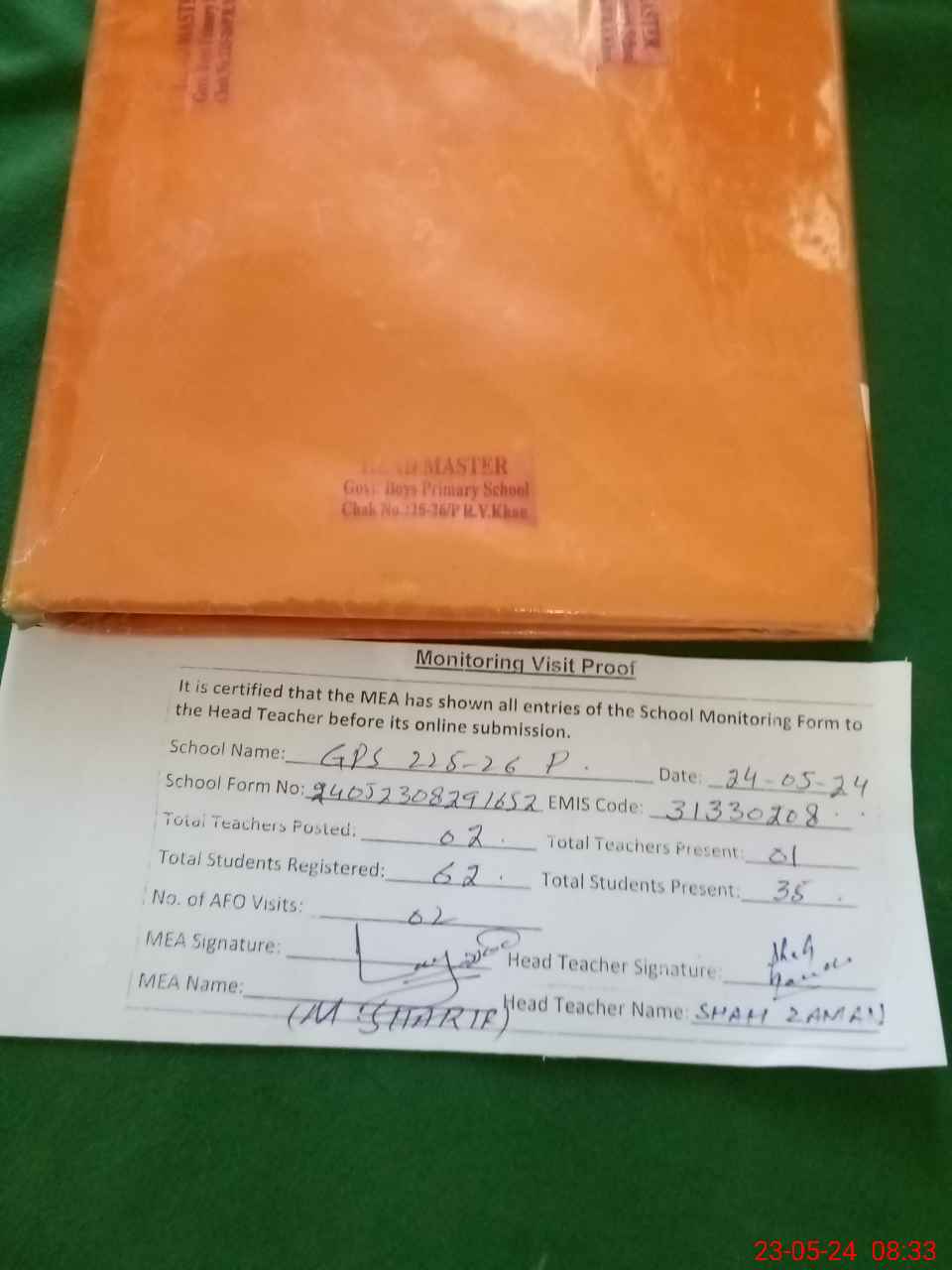 | Attendance Register | Head Teacher | MEA with School | Visit Proof |