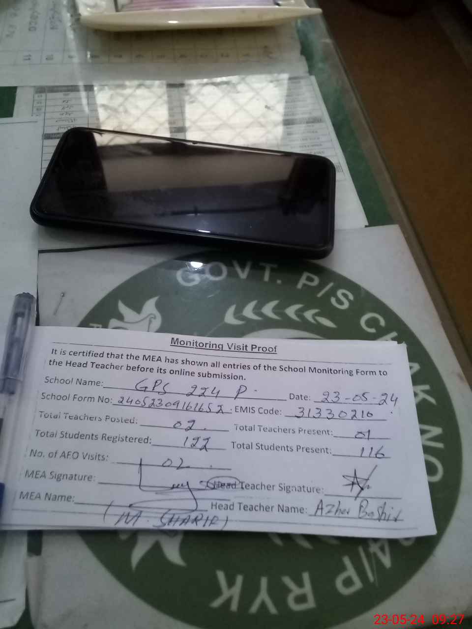 | Attendance Register | Head Teacher | MEA with School | Visit Proof |