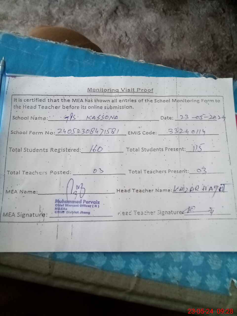 | Attendance Register | Head Teacher | MEA with School | Visit Proof |