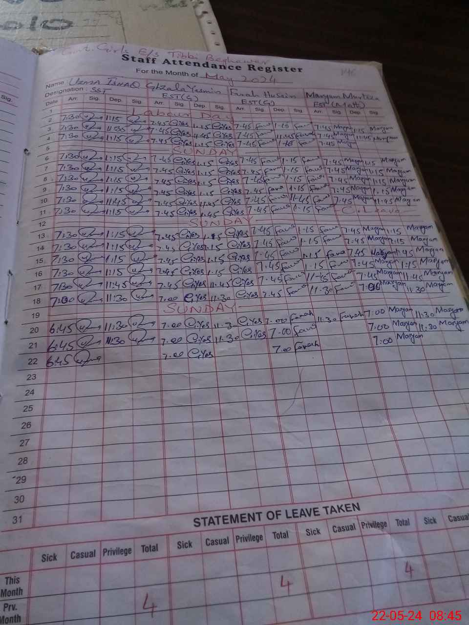 | CNIC | Full Name | Designation | R/C | Absence During Last Calender Month |