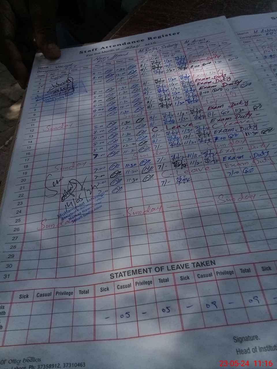 | CNIC | Full Name | Designation | R/C | Absence During Last Calender Month |