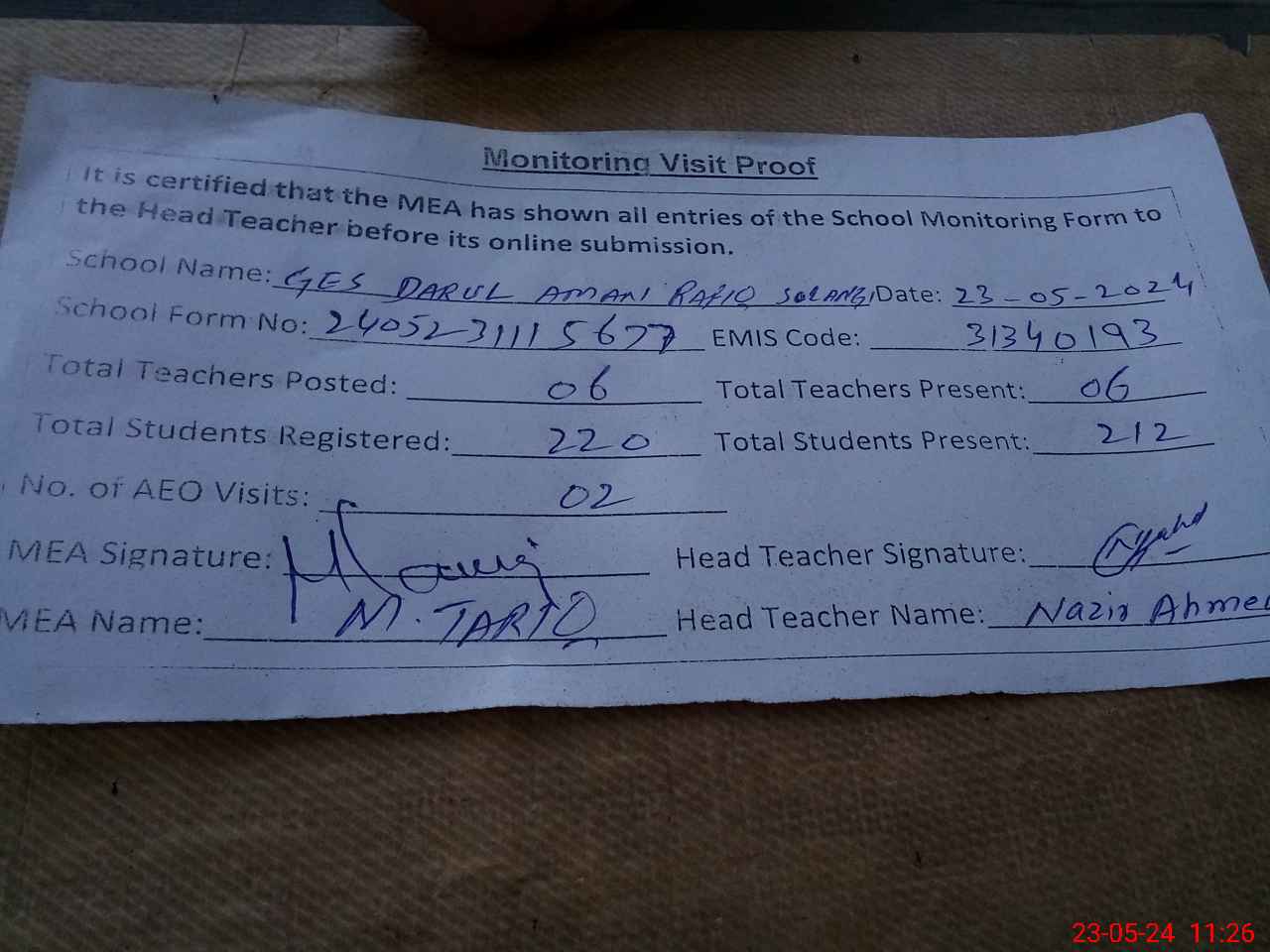 | Attendance Register | Head Teacher | MEA with School | Visit Proof |