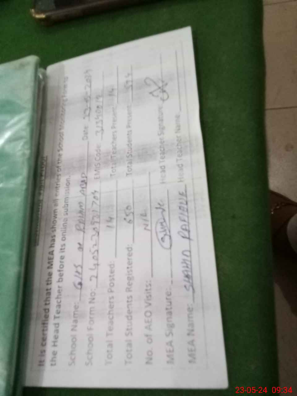 | Certified that this School was Inspected by the Undersigned MEA/DMO Today and the Information Stated Above is as Per Record. | |||||