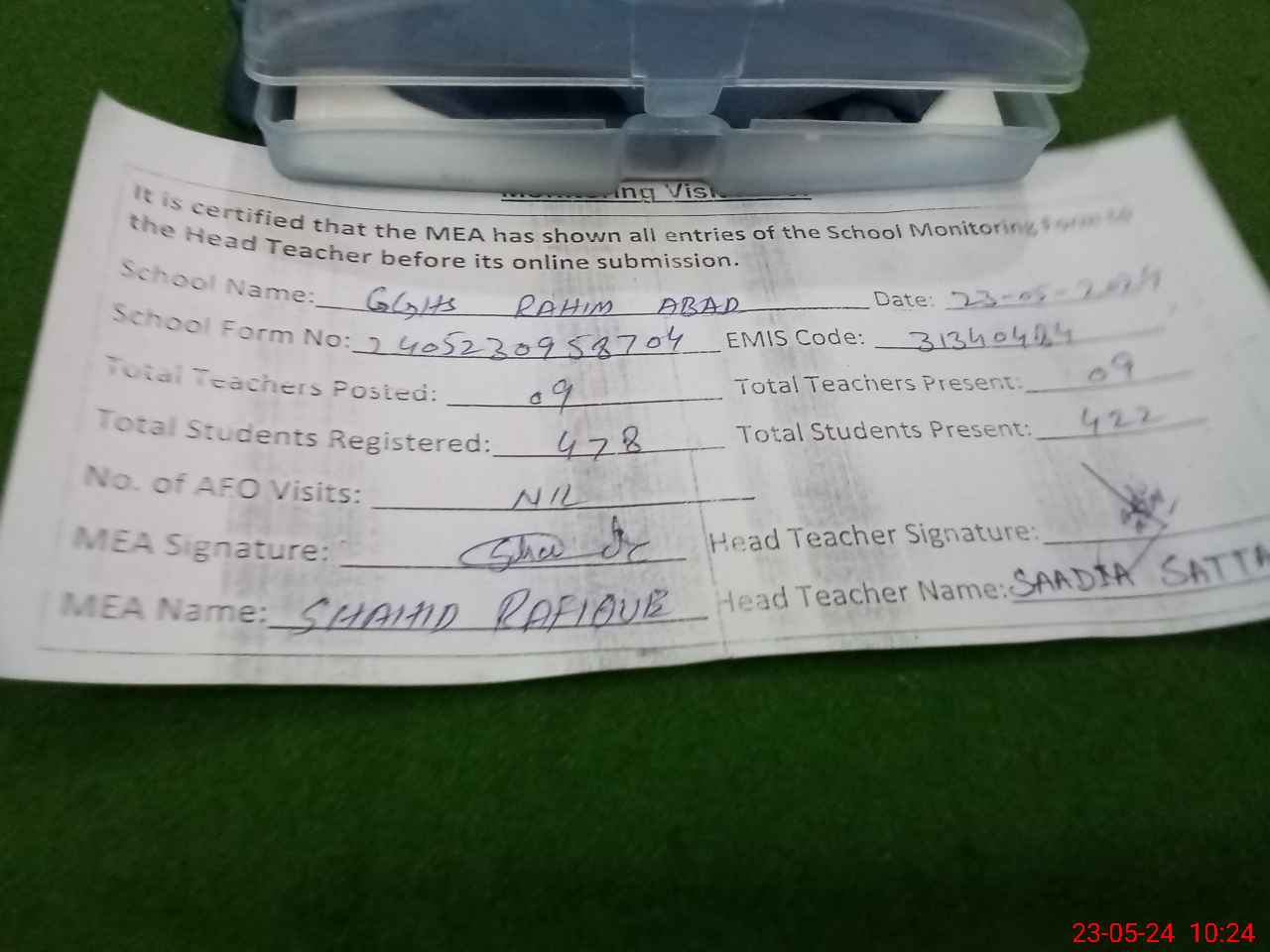 | Monitoring Date: 23-05-2024 | Start Time: 23-05-2024 09:50 AM | End Time: 23-05-2024 10:27 AM | Name of MEA: Sh**** Ra**** | |